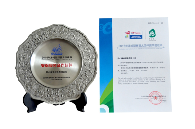 近日,從2016年湯姆斯杯暨尤伯杯賽組織委員會獲悉,昆山市保安服務有限公司榮獲“安保服務合作伙伴”榮譽稱號。