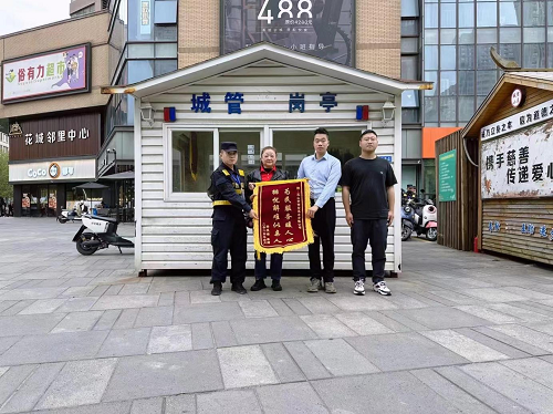 2024年5月13日下午15點左右,安保公司下屬保安公司花橋城市管理三中隊朱圣強與張寶平帶領隊員在昆山市花橋鎮萬科內外街交界處巡查時,張寶平發現在俗有力超市門口的一輛電瓶車的座椅上有一部手機,隨即上前查看后發現是最新的蘋果手機,隨即項目經理朱圣強安排張寶平在電瓶車邊上等待失主,但是經過半小時左右等待失主還未出現,所以安排張寶平把手機放在身上等失主電話,下午4點多時候張寶平接到失主電話后,經電話確認以及指紋解鎖面部解鎖后歸還失主,失主表示說她最近才在萬科內街開的燒烤店,之前北門外也有賣燒烤的流動商販,后來我們隊員加強管理后賣燒烤的流動商販來的少了,加上這次撿手機的事情,所以想要請大家吃飯表達感謝,項目經理朱圣強隨即表示這是我們應該做的,不用了吃飯了,隨后市民贈送了一面錦旗表示感謝。