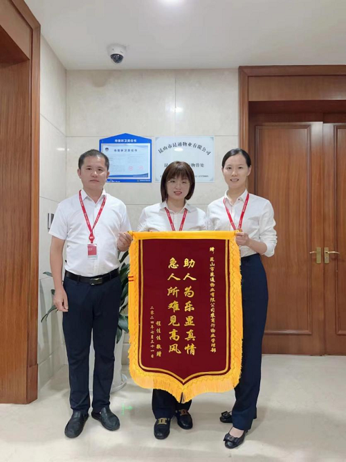 8月9日,昆通物業保安員仇國玉和楊福建像往常一樣在負責的區域巡邏,他走到南廣場快遞房門前時,一個閃閃發光的物件引起了他的注意,走近一看,竟是一只價值不菲的金手鐲。面對這意外之財,仇國玉和楊福建沒有絲毫猶豫,第一時間想到的是盡快找到失主。他們立即將金手鐲妥善保管,并向物業經理報告了情況。隨后,通過多方努力,歷時兩天,終于聯系到了焦急萬分的失主。當失主看到失而復得的金手鐲時,激動之情溢于言表,對仇國玉和楊福建連連道謝,并送上了一面寫有“助人為樂顯真情,急人所難見高風”的錦旗。