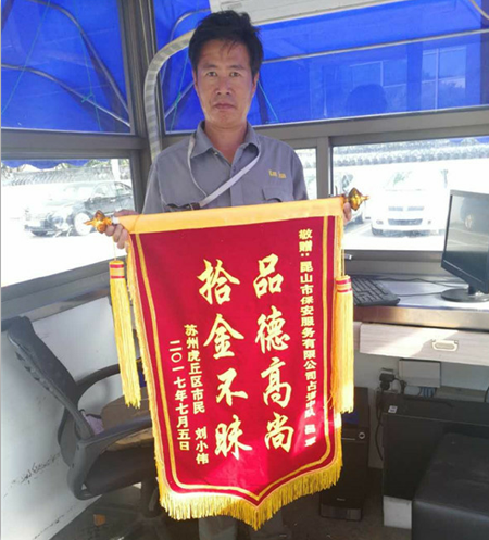近日,保安公司停車收費中隊收到一面市民贈送的錦旗,原來是7月4日下午,停車收費員呂軍在中山路停車場巡視時,在崗亭附近撿到一只黑白混色背包,發現包內有多件電子產品及重要證件,隨后呂軍立即向110指揮中心報告了情況,后通過警方的幫助找到了失主,失主為了表達感激之情,特贈送了一面致謝錦旗。