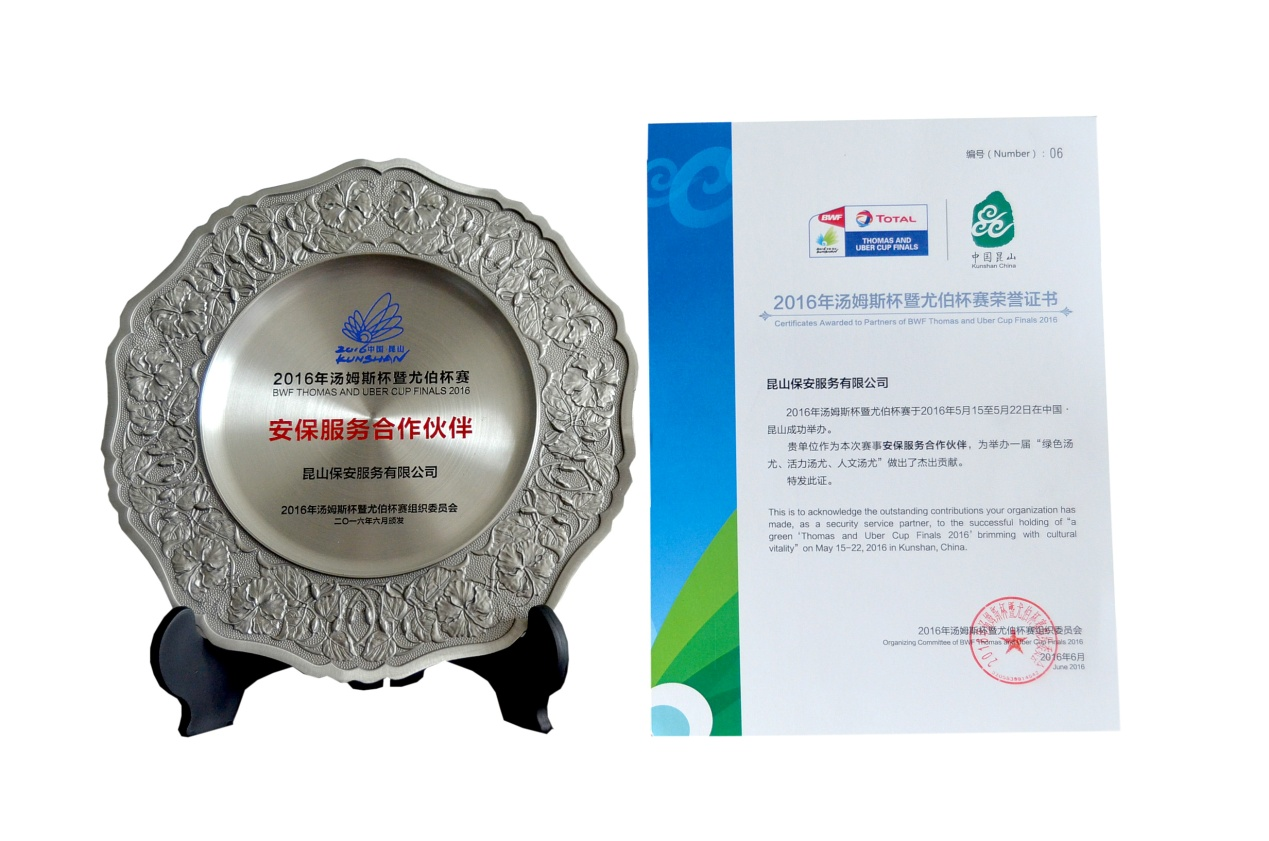 近日,從2016年湯姆斯杯暨尤伯杯賽組織委員會獲悉,昆山市保安服務有限公司榮獲“安保服務合作伙伴”榮譽稱號。