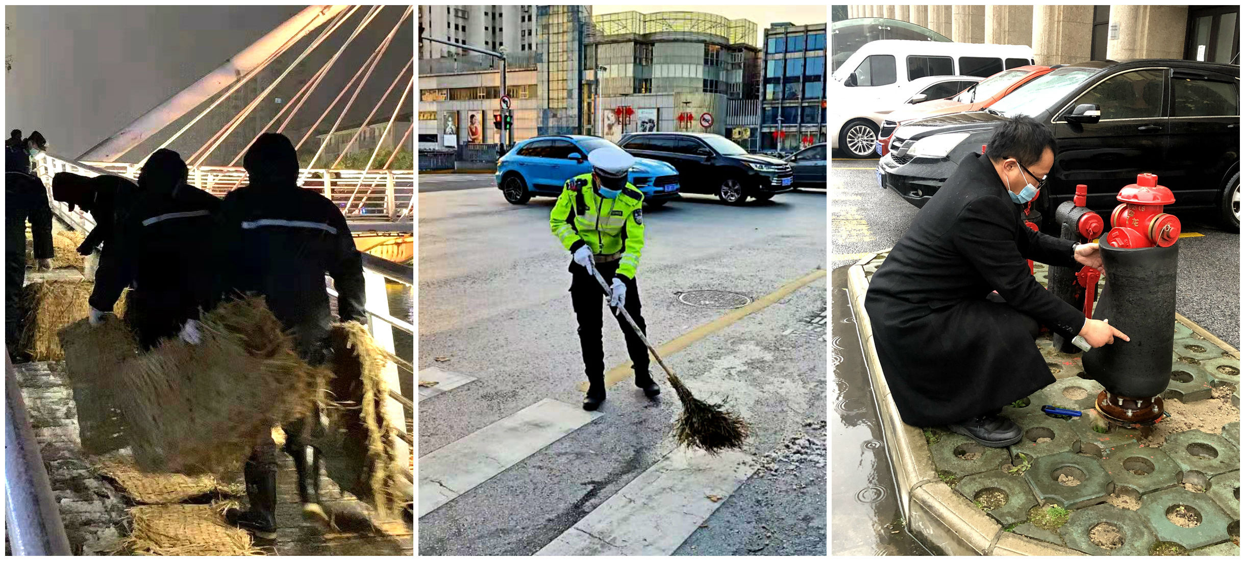 安保公司高度重視此次降溫防寒工作,召開專題會議,部署防寒潮工作任務,制定防寒潮工作方案,成立安保公司專項應急工作小組,統一領導、指揮和協調防寒潮工作,確保各項工作落到實處。寒潮來臨前夕,公司駐點各個中隊針對業務范圍對易積雪、結冰部位進行全面排查,并開展針對性防寒潮措施,連夜鋪設草墊等防滑物料,保障市民出行安全。次日清晨,部分路面出現冰凍現象,公司隊員始終堅守崗位,并提前到達工作崗位,掃除路面冰凍,維護公共秩序。