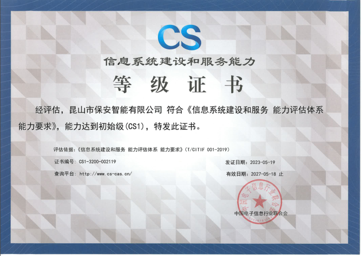 喜報!保安智能公司成功取得信息系統建設和服務能力CS1證書