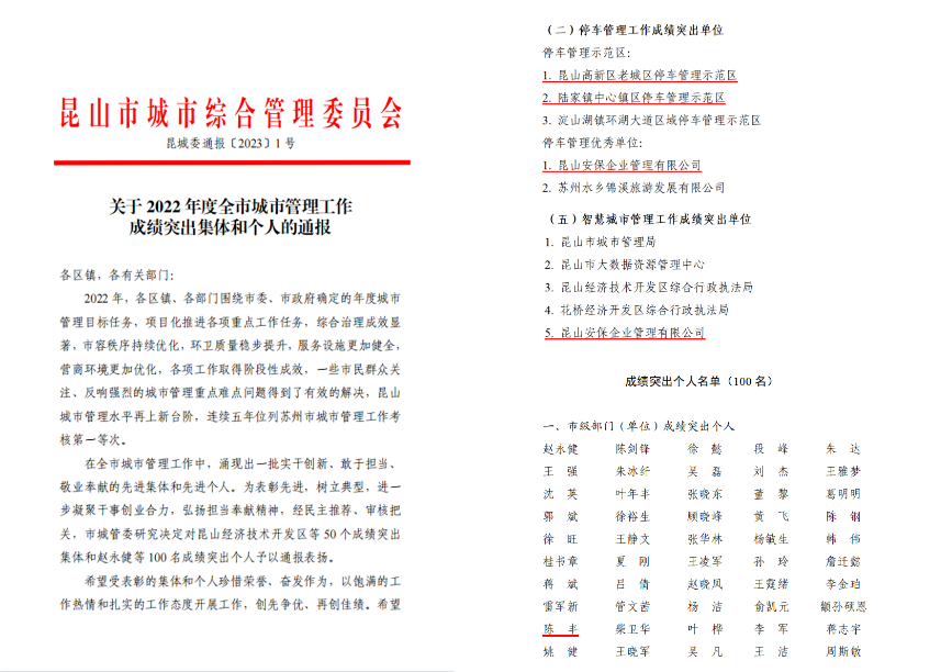 近日,在昆山市城市綜合管理委員會印發《關于2022 年度全市城市管理工作成績突出集體和個人的通報》中,昆山安保企業管理有限公司被評為“停車管理優秀單位”、“智慧城市管理工作成績突出單位”。所管理的昆山高新區老城區停車管理示范區和陸家鎮中心鎮區停車管理示范區被評為“停車管理示范區”,安保公司總經理助理陳豐被評為“成績突出個人”。